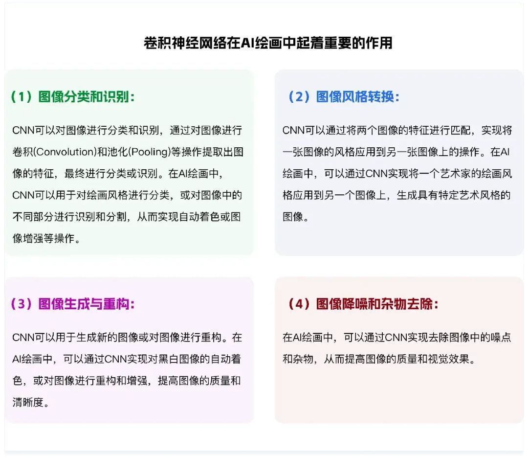 卷积神经网络可以对图像进行分类、识别和分割等操作,同时也是实现风格转换和自适应着色的重要技术之一。卷积神经网络在AI绘画中起着重要的作用,主要表现在以下4个方面: