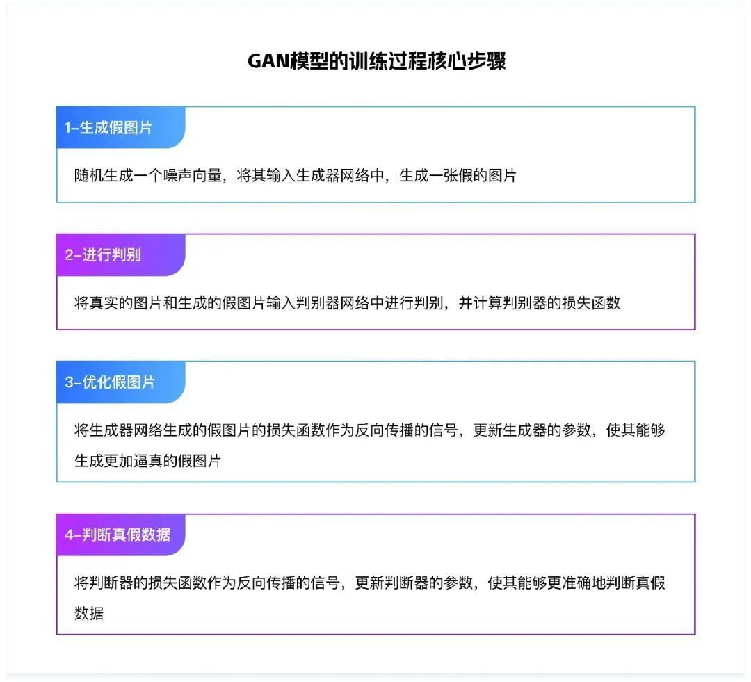 生成对抗网络的目标是通过训练两个模型的对抗学习生成与真实数据相似的数据样本,从而逐渐生成越来越逼真的艺术作品。GAN模型的训练过程可以简单描述为几个步骤: